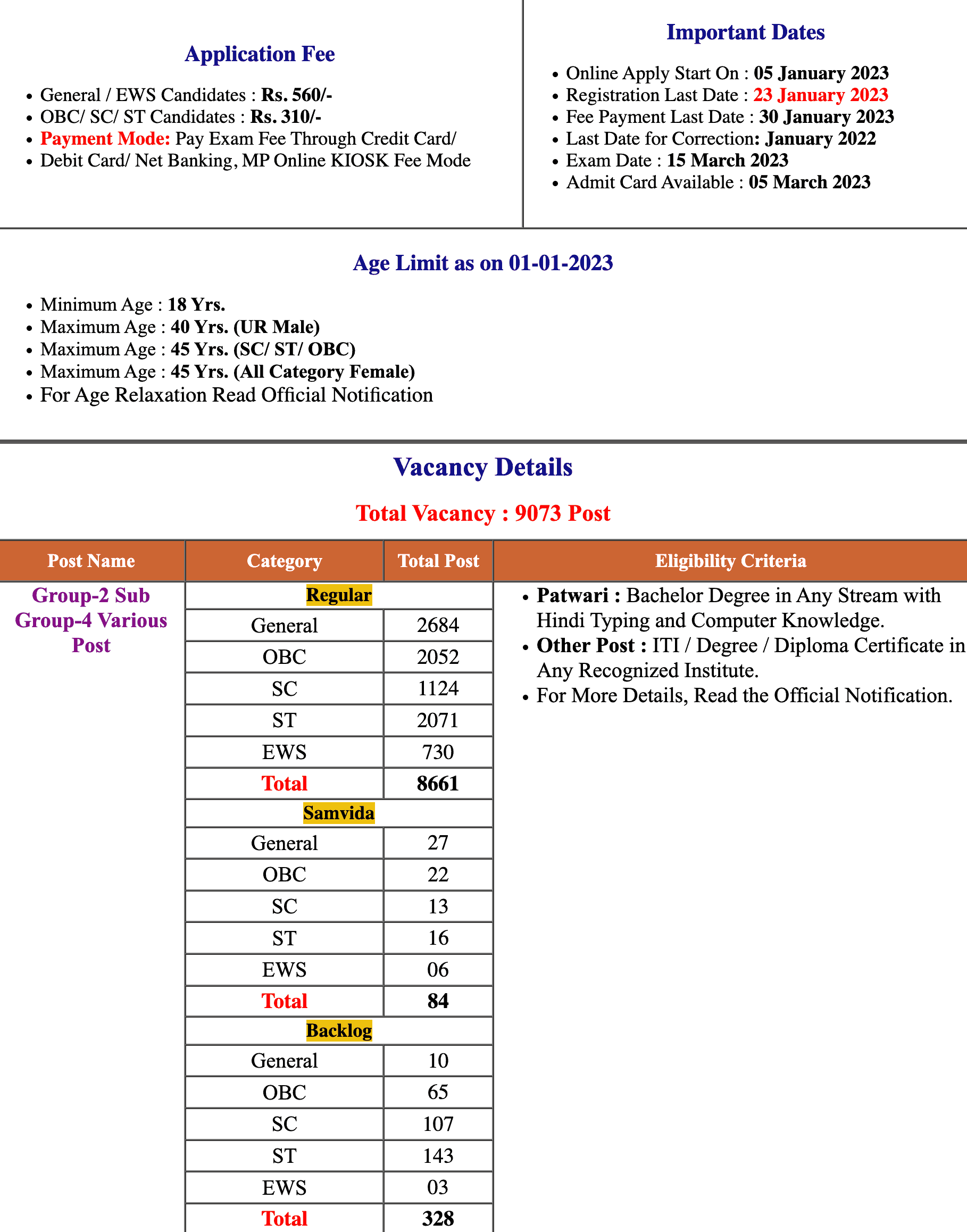 Madhya Pradesh Employee Selection Board (MPESB)MPESB Patwari & Other Post Admit Card 2023 |