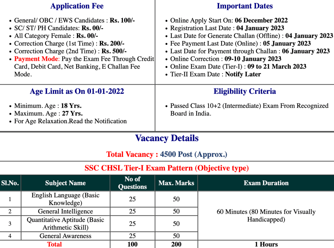 Staff Selection Commission (SSC)SSC CHSL 10+2 Tire I Exam Date Notice 2023 |